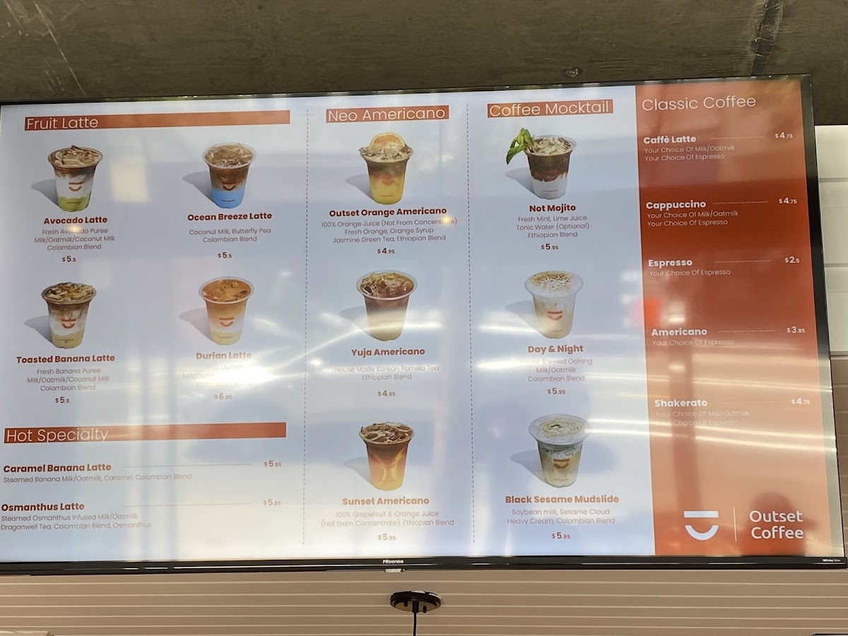 Welcome to Outset Coffee - Valencia, a coffee shop nestled in the heart of San Francisco on Valencia Street. This vibrant spot is a haven for coffee lovers seeking unique flavor profiles and innovative drinks. The menu features standout creations like the Banana Latte, made with fresh banana puree and Colombian blend coffee, served in eco-friendly, recyclable cans. The Neo Americano adds a twist with house-made Korean pomelo juice paired with an Ethiopian blend, creating a refreshing experience.